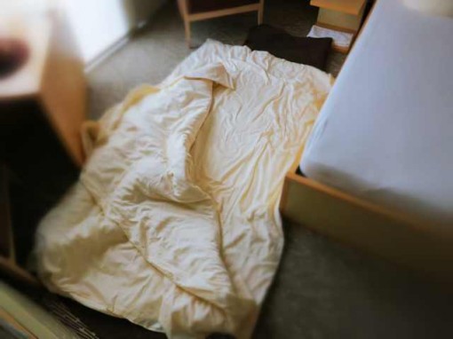 ich schlafe jetzt seit 10 Tagen auf dem Boden, die ersten Nächte hatte ich mir eine 1,5cm dicke Gymnastikmatte untergelegt. Die ersten Nächte waren erstaunlich gut. Ich bin zwar nachts häufiger aufgewacht, weil es unbequem wurde und habe mich jedes Mal ziemlich bewusst auf die andere Seite gedreht, aber konnte immer gleich wieder einschlafen. Morgens bin ich tatsächlich ausgeruht und erholt und ohne Schmerzen aufgewacht. Nur an den Oberschenkeln (also da, wo ich am breitesten bin ;-)), hatte ich nach drei Tagen Druckstellen. War nicht weiter schlimm, aber doch irgendwie doof. Also habe ich mir deswegen – und weil ich es doch etwas kuscheliger haben wollte – noch eine dünne Zudecke druntergelegt und nun schlafe ich einfach nur noch göttlich.