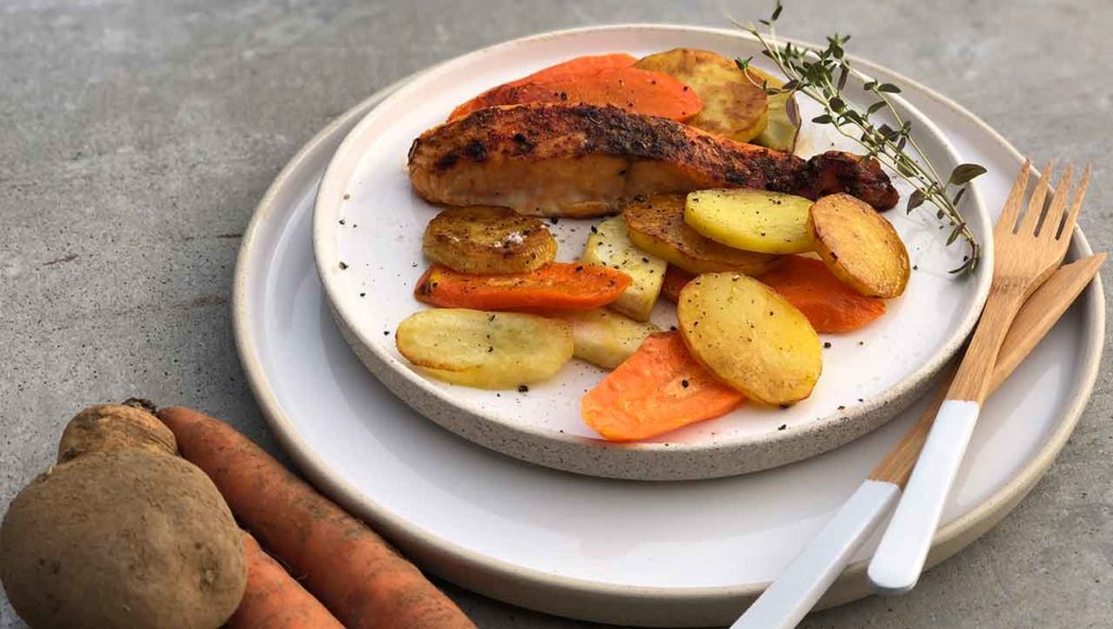 Lachs ist vollgepackt mit wertvollen Omega 3 Fettsäuren und Wurzelgemüse ist ein Festmahl für deine Darmflora.